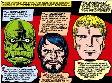 The Eternals were content to pursue meditation and other spiritual practices and the Deviants kept themselves busy with their infernal machines while humankind were ruling the roost. The two races only made themselves known to the world when the gods- or Anunaki, if you prefer-- returned to take stock of the Project. Kirby didn't seem to be familiar with 2012 prophecies but would certainly have incorporated it if he had. The story all kicked off in a Kirbyesque Inca tomb, which could easily be Kirbyesque Mayan if need be.