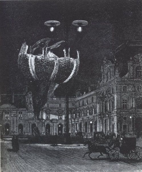 From the same book, we see a version of Ernst's alter ego, "Loplop, Bird Superior," looking for all the world like the Mothman. He's even drawn to the streetlights, like a moth.