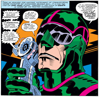 And here we meet the Night Flyer, who talks on a strange telephone with Death himself, or perhaps the Devil or even some lesser demon. Or maybe an alien posing as Death. Or maybe it's just a jacked-up Malibu Barbie play phone. Who knows? The concept itself is important, since this ties into this whole idea of electronic communication with invisible entities that is such a thruline with this series and Kirby's work in general.