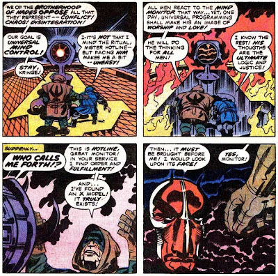 And here's where it gets even stranger- Kirby introduces another of his countless secret societies, the "Brotherhood of Hades," whose goal is "universal mind control." Their means will be the "Mind Monitor," which is essentially the Internet. With the Devil's face via a hologram for you Blue Beam buffs. In 1977.The leader of this cult is one "Mister Hotline," just to continue to drive home this theme of daemonic communication. He's not entirely un-Crowley-like himself.