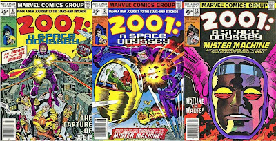 The daemonic communication idea seemed to get a hold of Kirby, as did the idea of high technology and the pursuit of perfection being turned against us. We looked at Kirby's run on 2001: A Space Odyssey, and I may have explained that halfway through the series (which was really just a ten-issue gimme tacked onto the deal for the movie adaption) Kirby decided that the Star Child was hogwash, and that humankind will never reach the stars-- we'll build machines to do it for us.Kirby hated working on other people's ideas anyway so he decided to use the book to launch a new character that would eventually get his own title (Machine Man) when the contract with MGM was up. The covers here are interesting in that they have absolutely nothing to do with the Space Odyssey concept at all, but have Mister Machine (aka X-51) as King Kong/Ape of Thoth figure (which never happens in the story), fighting egg-shaped UFO kind of craft (taking us right back to the Amalantrah Working) and appearing as a John the Baptist-type sacrificial figure.