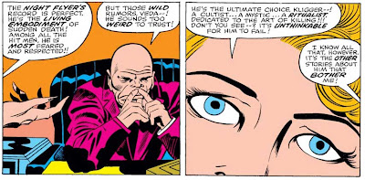 Kirby would unleash a whole host of weird ideas afterward, but his final storyline in Captain America also bears a look. In "The Night Flyer" Kirby introduces us to another Lex Luthor (and by extension Crowley) lookalike named Kligger, who heads over The Corporation, an organized crime concern masquerading as a legitimate business. So Kligger's gal friday Veda suggests they hire the Night Flyer, a "ritualist" killer, to deal with a stool pigeon under SHIELD protection.