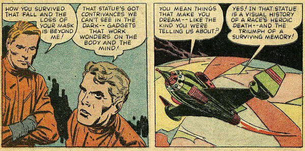 As we saw in the splash page, a team of astronauts lands on Mars and discovers the Face. An astronaut falls into the eye of the Face and finds himself in a strange landscape. He finds he can breathe the air and sees a race of elegant giants walking around Martian cities in sci-fi finery, all of it strongly reminiscent of Barsoom of in 20s-vintage John Carter novels.