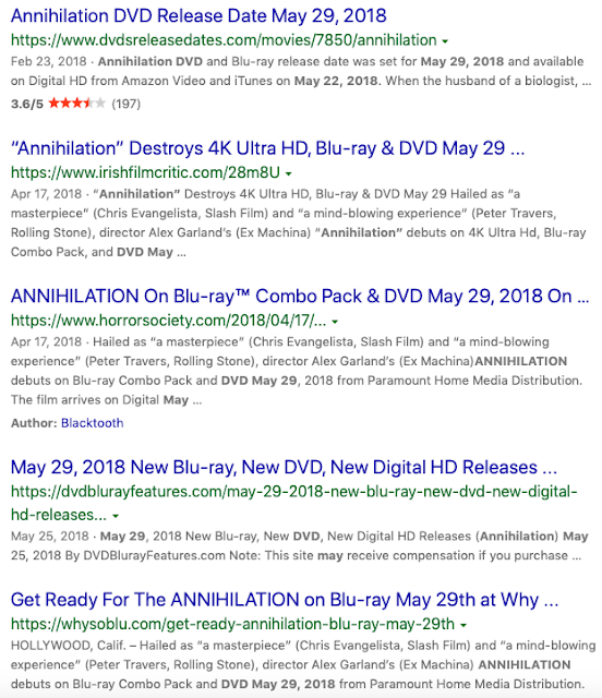 And bearing in mind the sync with the film's release and the premiere of "Pearly Dewdrops' Drop" and the appearance of SN1987A, do note that the Annihilation DVD was released on the 21st anniversary of Jeff Buckley's death.